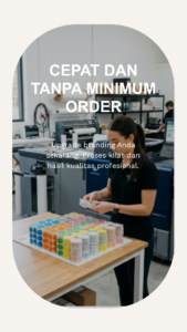 Keduanya sama-sama tahan air dan tahan lama — bedanya hanya di tampilan akhir. Glossy terlihat mengkilap dan warna lebih vibrant, cocok untuk produk yang ingin tampil bold dan eye-catching. Doff atau matte terlihat elegan, lebih tahan sidik jari, dan memberikan kesan premium yang lebih sophistcated — populer untuk produk skincare lokal dan produk artisan.