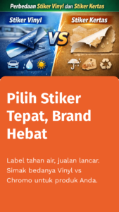 Umumnya vinyl 20–40% lebih mahal dari chromo untuk ukuran dan jumlah yang sama. Untuk order 200 lembar ukuran standar misalnya, selisihnya biasanya hanya puluhan ribu rupiah. Mengingat daya tahan dan kesan profesional yang jauh lebih baik, selisih ini sangat worth it — terutama untuk produk yang Anda jual secara serius di toko atau marketplace.